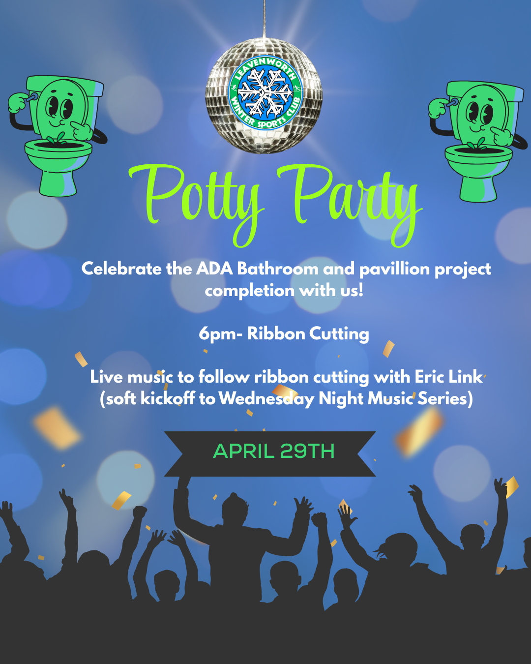 Ribbon cutting will be at 6pm directly followed by the first flush and then a dance party and live music with Eric Link on the pavilion.