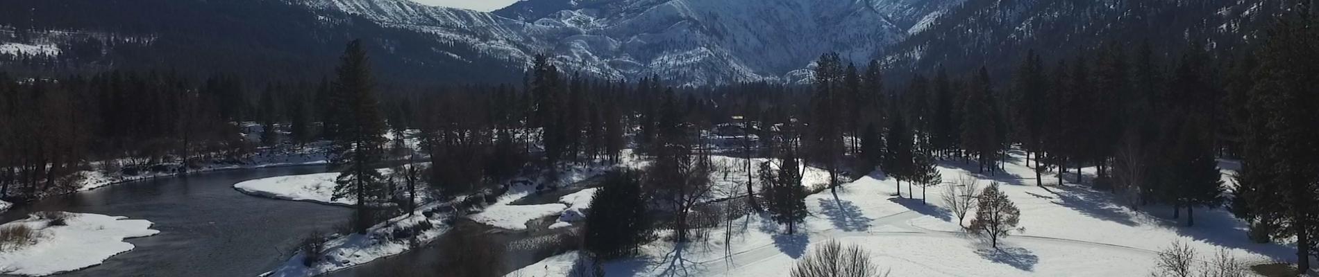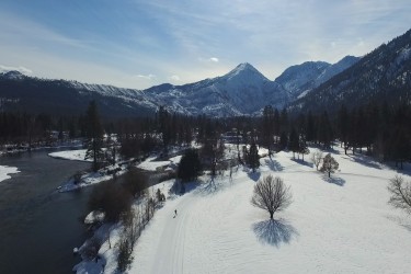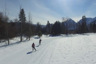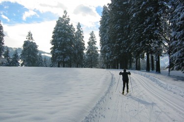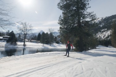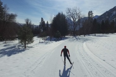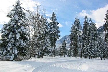 In this lovely setting the tracks and skating lanes climb hills to offer skiers spectacular views of the Wenatchee River below and the Cascade mountains beyond. They descend in wide sweeping curves or more thrilling direct runs to join the river before winding through open groves of huge pines to climb another hill.