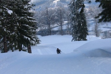 The Golf Course Snowshoe Trail is marked and maintained by the footsteps of the users. Do not venture onto the ski trails - snowshoeing is not allowed on the groomed skiing surface.