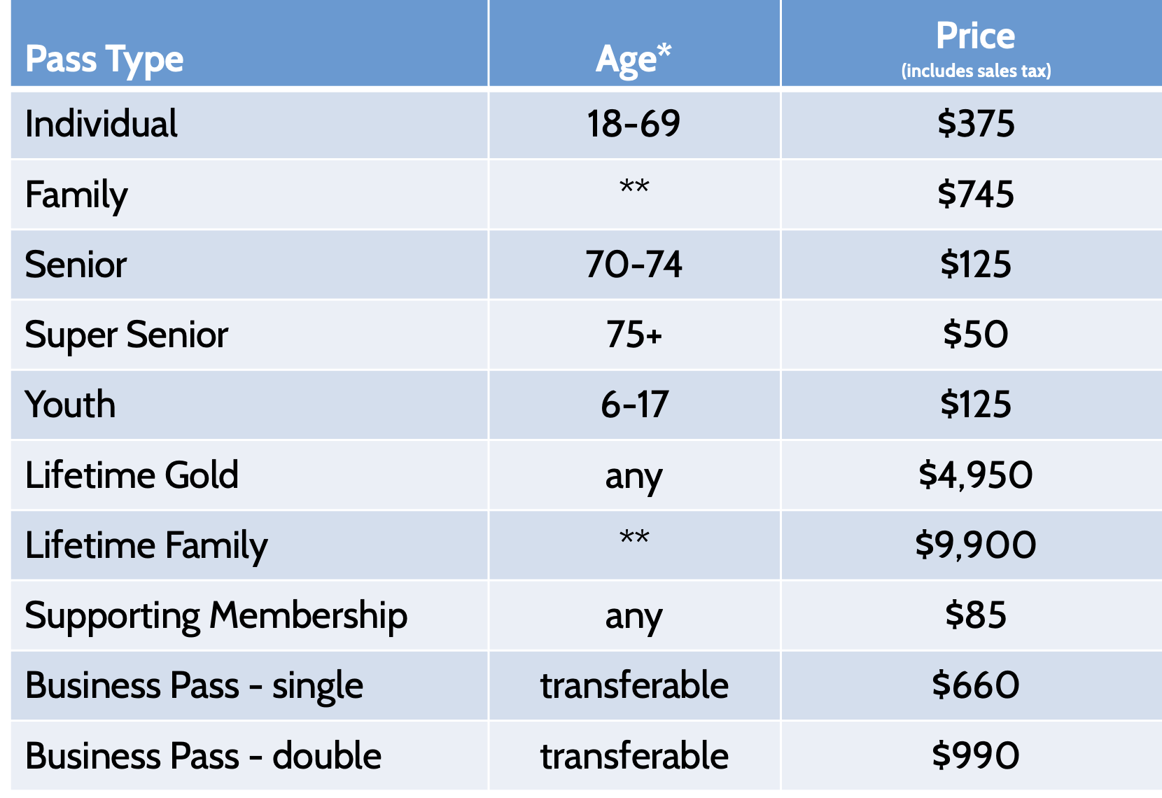 ~ Lifetime Gold Passes are good for the lifetime of the purchaser. Lifetime Family = good for the lifetime of the parent(s), plus their dependents through 21 years of age. Non-transferable. Venues and benefits subject to change.~
